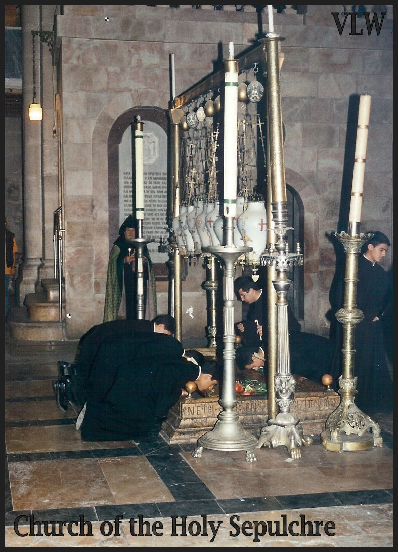 The Via Dolorosa ends at the Church of the Holy Sepulchre over the site where tradition places the tomb of Jesus. (interesting to note that everyone always kisses the stone, but the Latin inscription reads: “He is not here. He is Risen.” – Abuna Chacour pointed that out once & i never forgot!)