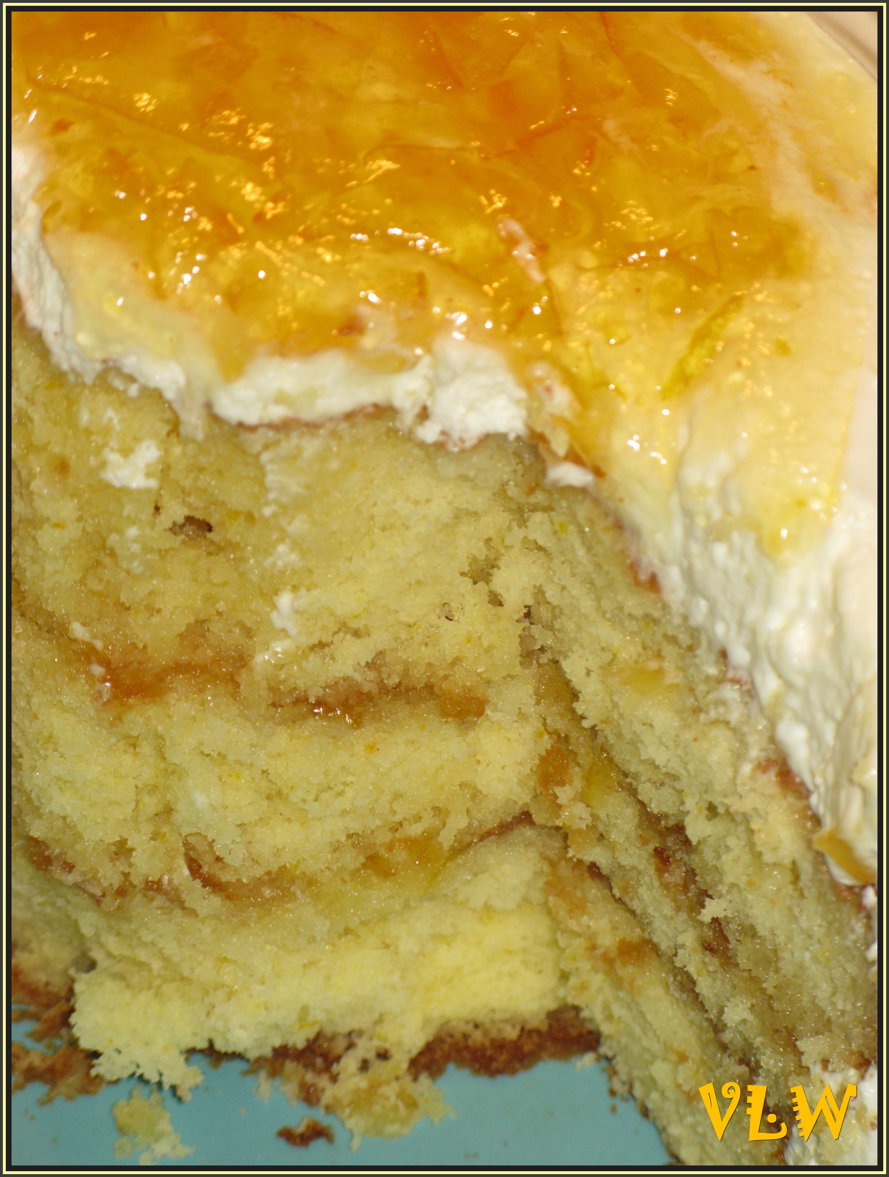 To make this into a Three-Layer (with White Lily Flour) – lose the Baking Powder… use 3 1/4 cups flour, 2 & 2/3 cups sugar, 5 eggs, 2/3 cups vegetable oil (safflower has no cholesterol) – add oil after the eggs & beat for one minute before adding the buttermilk mixture … bake the 3 layers for 35 minutes & then double the marmalade & double the sour cream/ whipped cream mixture (it makes for a fluffy delicious topping- you will want MORE!)