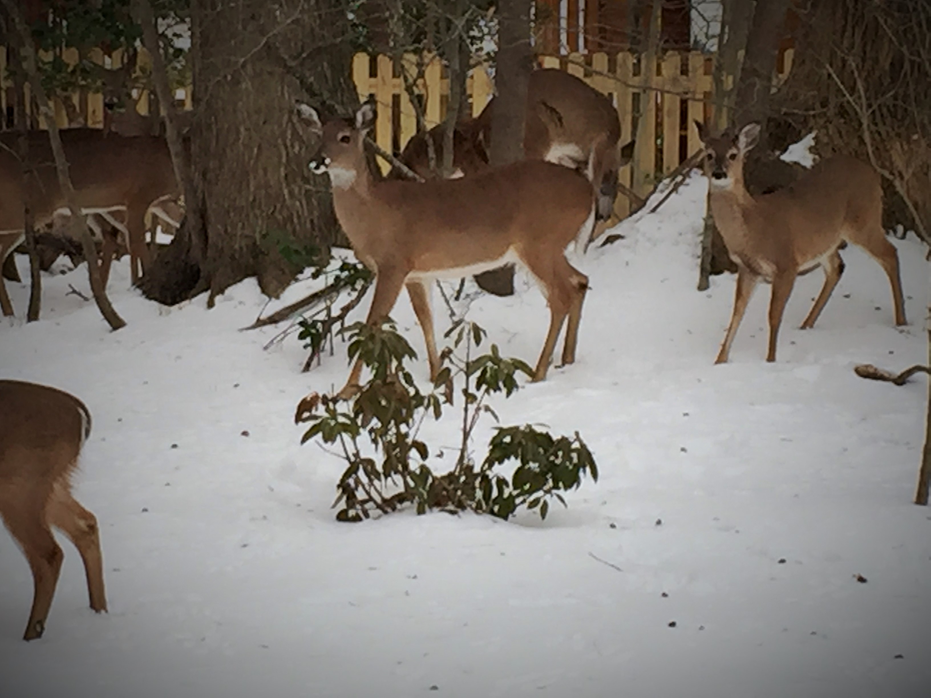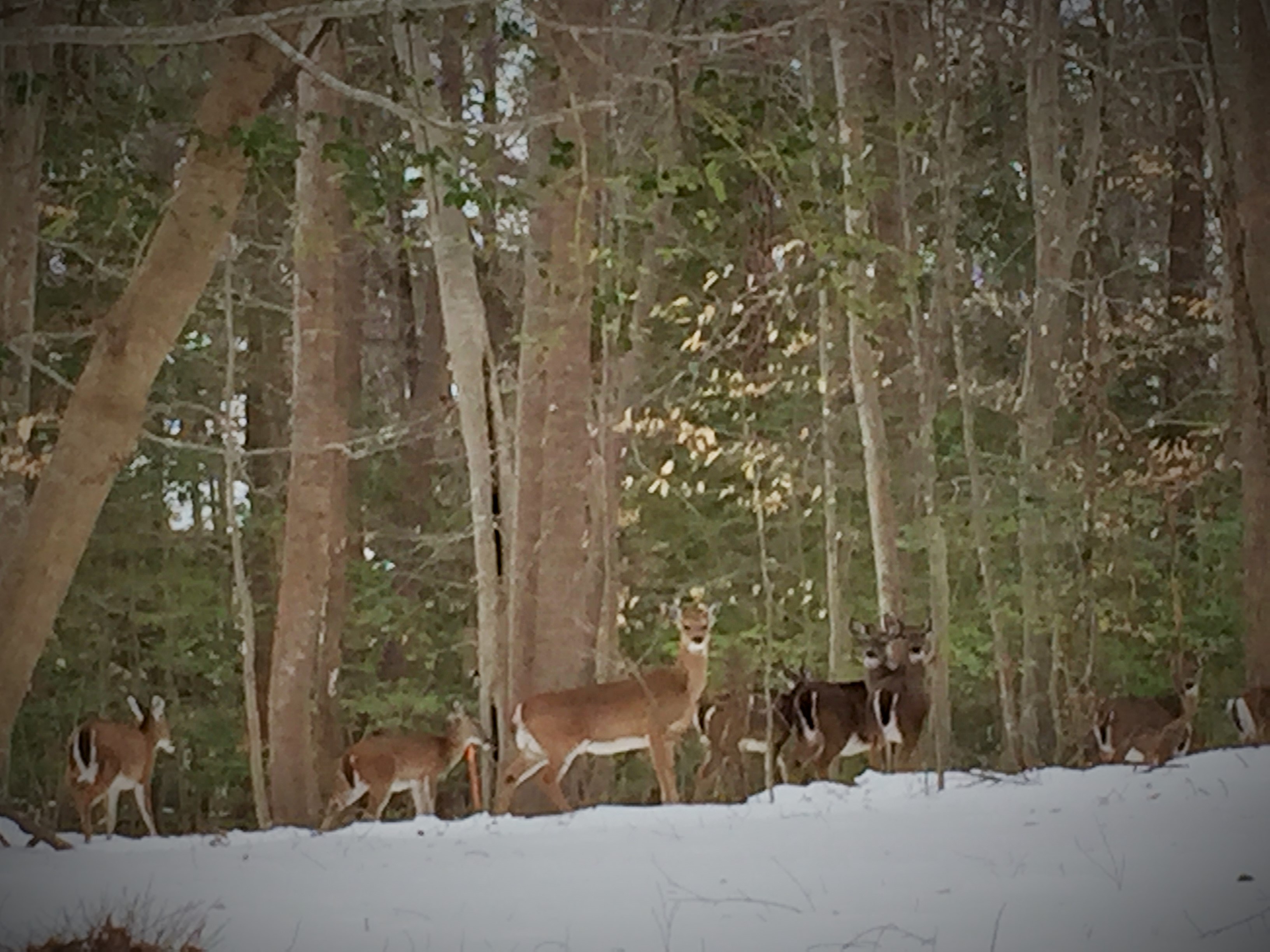 Today while Mama & i were working on stuff in the kitchen we looked out to behold the most amazing site — deer, lots of deer, hanging out in our snowy yard.  Grabbing my handy iPhone i stuck my nose out the back door … they looked up.  And kept munching.