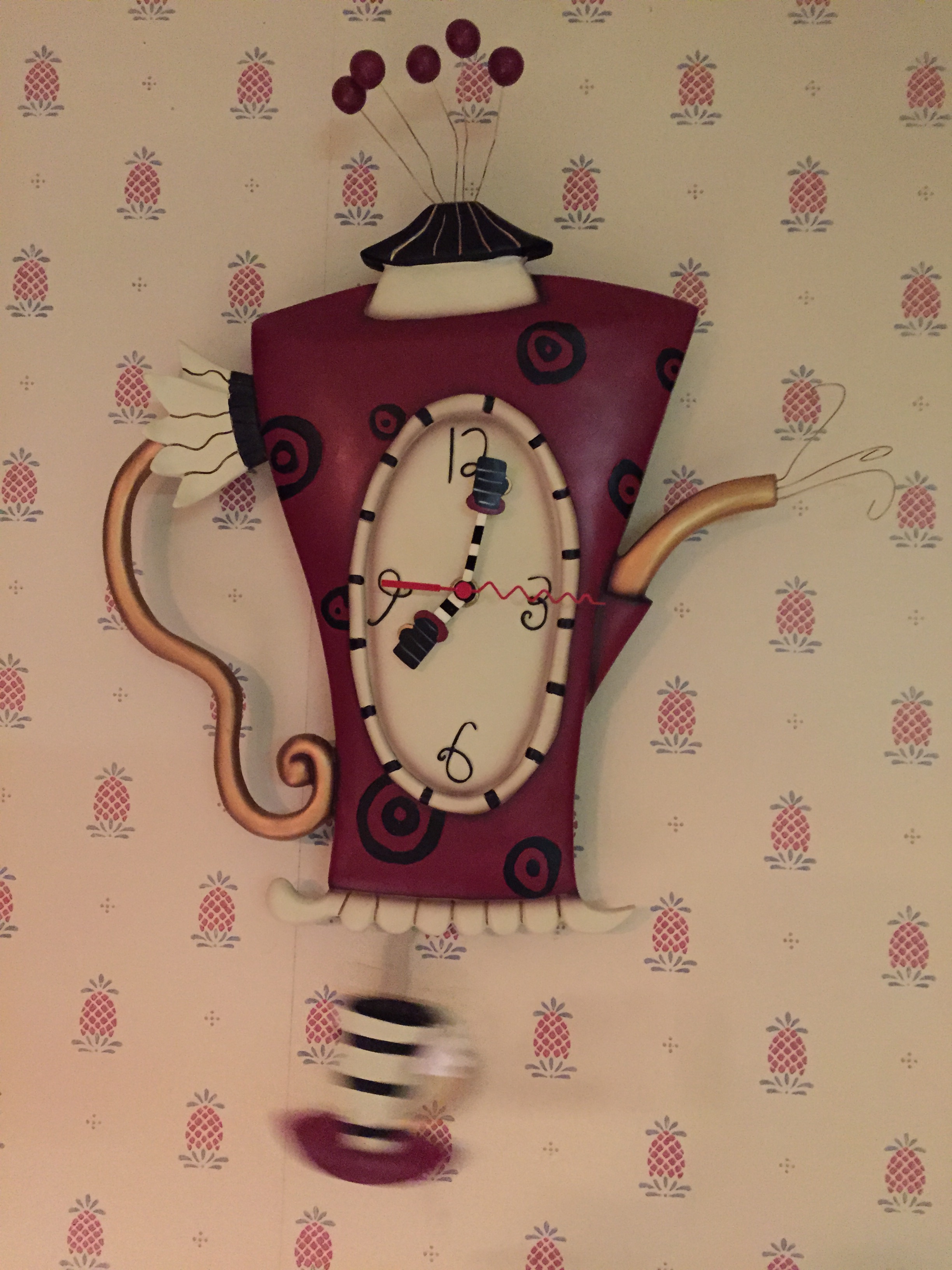 Thanks Cin -we really like our kitchen tea-pot clock (!!!) but my fav is the glass clock with the bluebird brought home (carefully) from Quebec City. Big blessings your way!! grace, peace & cool clocks — gL : )