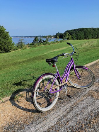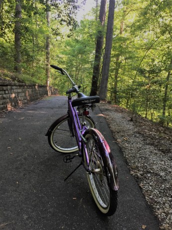 Consider cyclists bedecked in seriously tight biker gear on narrow bikes zipping as fast as they can down the road. Then, there’s Virginia on her purple bike enjoying the scenery, pedaling, but not so fast as to miss anything: blue birds, woodpeckers, trees, deer, turtles (& the occasional shirtless scenic joggersby.)