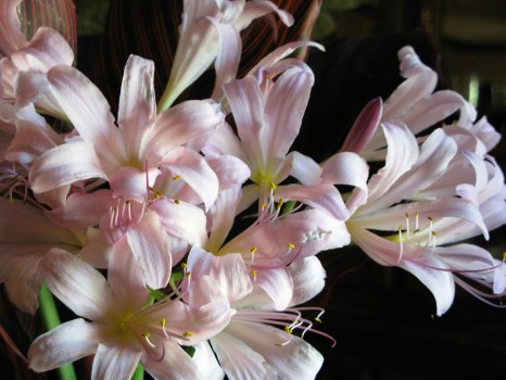 Not sure, Arlene, about the top – maybe pear blossoms? The lilies are a special variety that bloom only one day of the year – in August. A dear friend brought a cascade of them for Papa & Mama to enjoy. The fragrance was also spectacular. ✨🌷🌟🌷✨
