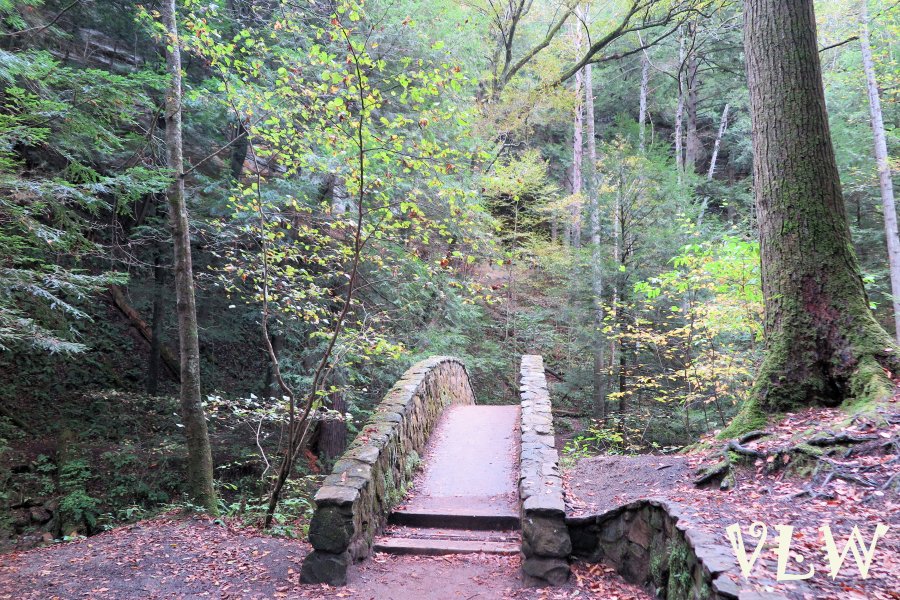 OH Hocking Hills lower falls bridge leafy view 2
