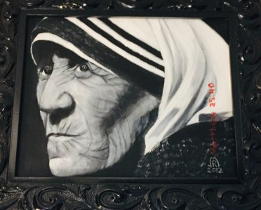 This picture of Mother Teresa, gifted and painted by a family friend, hangs on the wall by my desk.